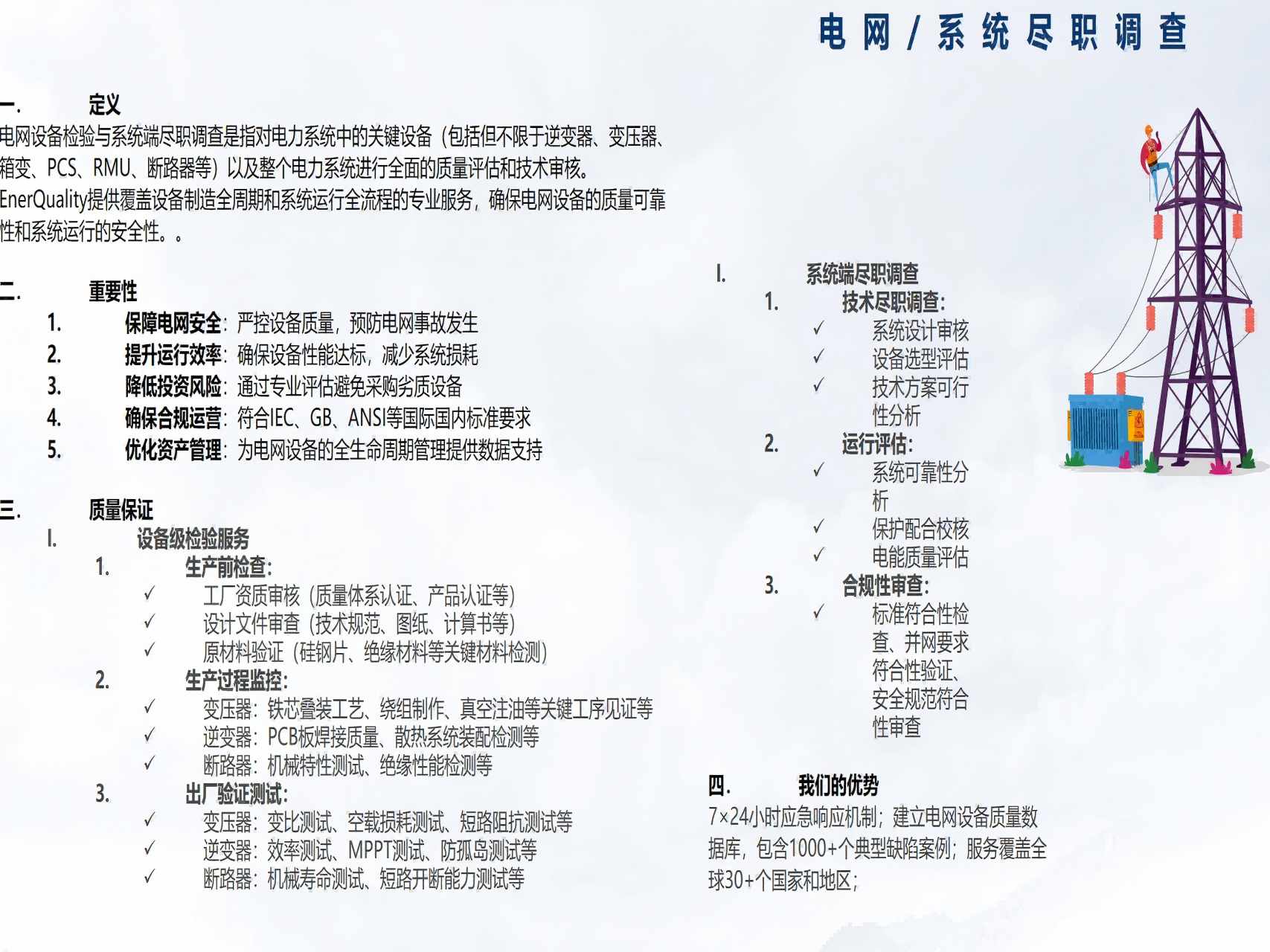 检验中心是保障光伏、储能、风能、氢能、电网设备质量与安全的关键枢纽,专注于该领域各类产品的全方位检验服务。我们配备国际前沿的检验设备,拥有一支深耕新能源的专业检验团队,严格遵循国家及行业相关标准,针对光伏、储能、风能、氢能、电网设备的特性定制检验方案。